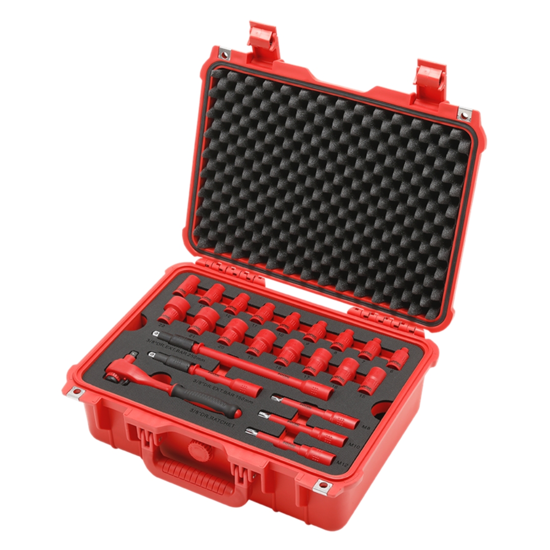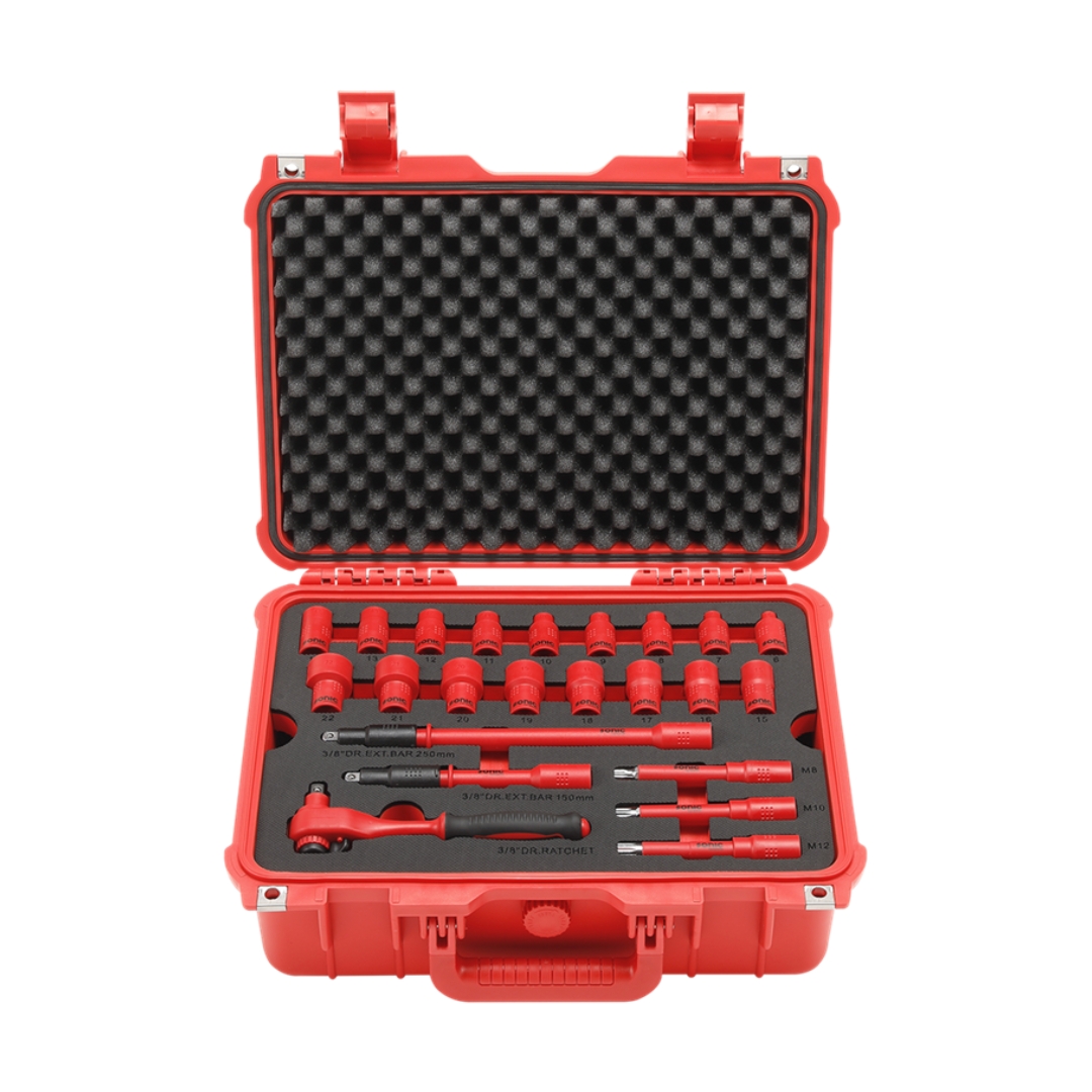 A comprehensive 50-piece insulated toolset that includes a variety of screwdrivers, sockets, extensions, ratchets, spline bits, and more!